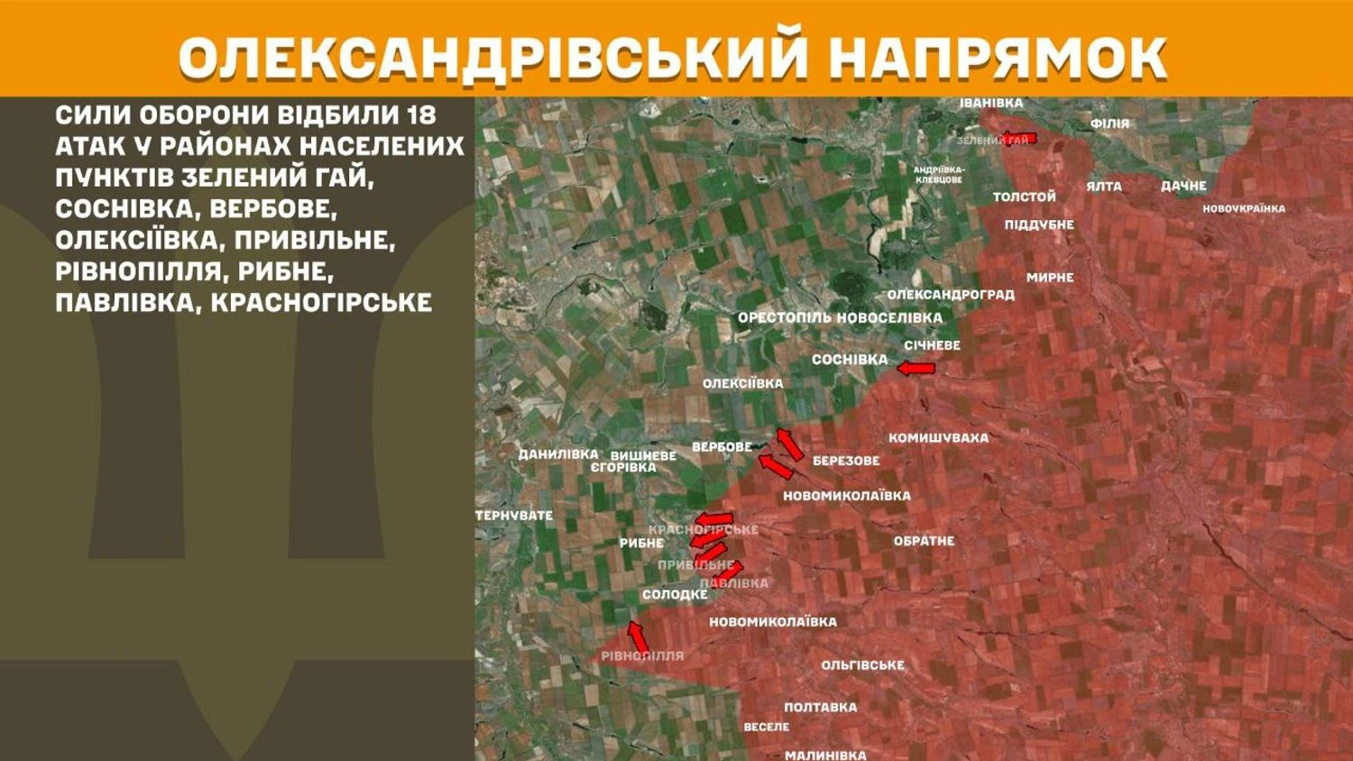 на Олександрівському напрямку Сили оборони відбили 18 атак у районах населених пунктів Зелений Гай, Соснівка, Вербове, Олексіївка, Привільне, Рівнопілля, Рибне, Павлівка, Красногірське;