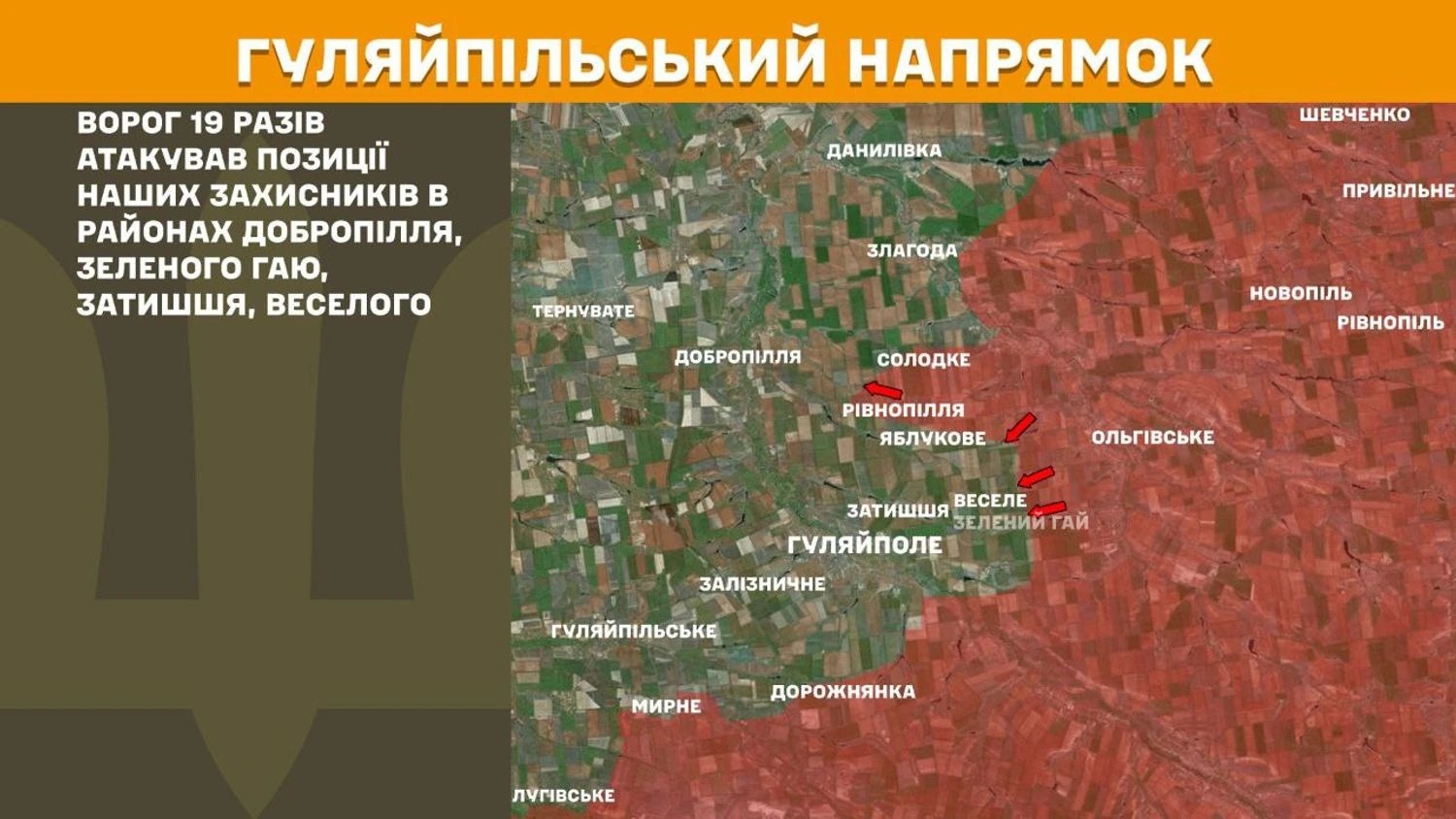 на Гуляйпільському напрямку ворог 19 разів атакував позиції наших захисників в районах Добропілля, Зеленого Гаю, Затишшя, Веселого;