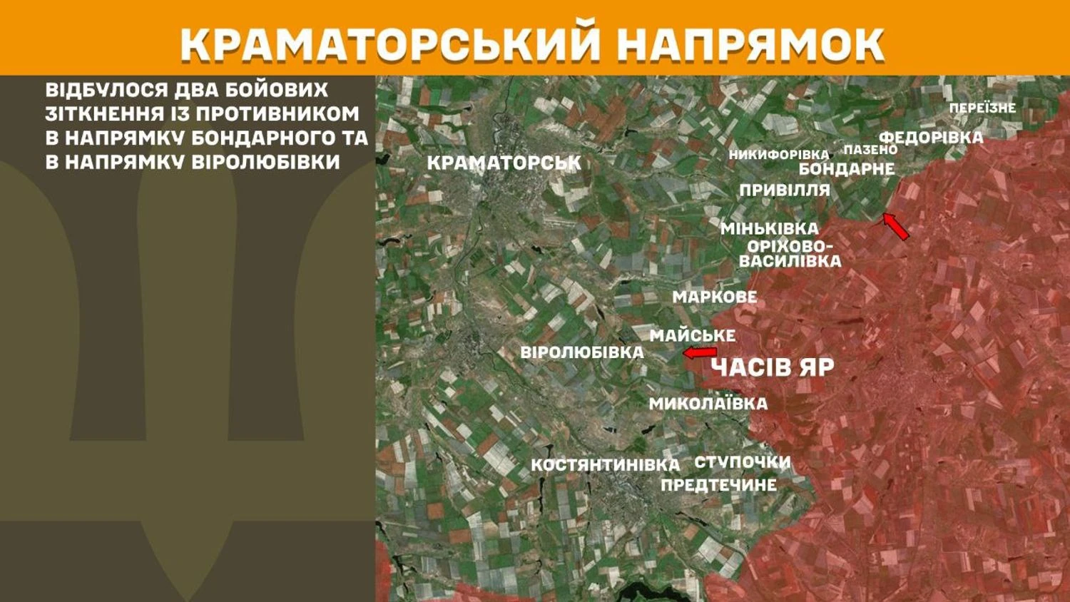 на Краматорському напрямку відбулося два бойових зіткнення із противником в напрямку Бондарного та в напрямку Віролюбівки;