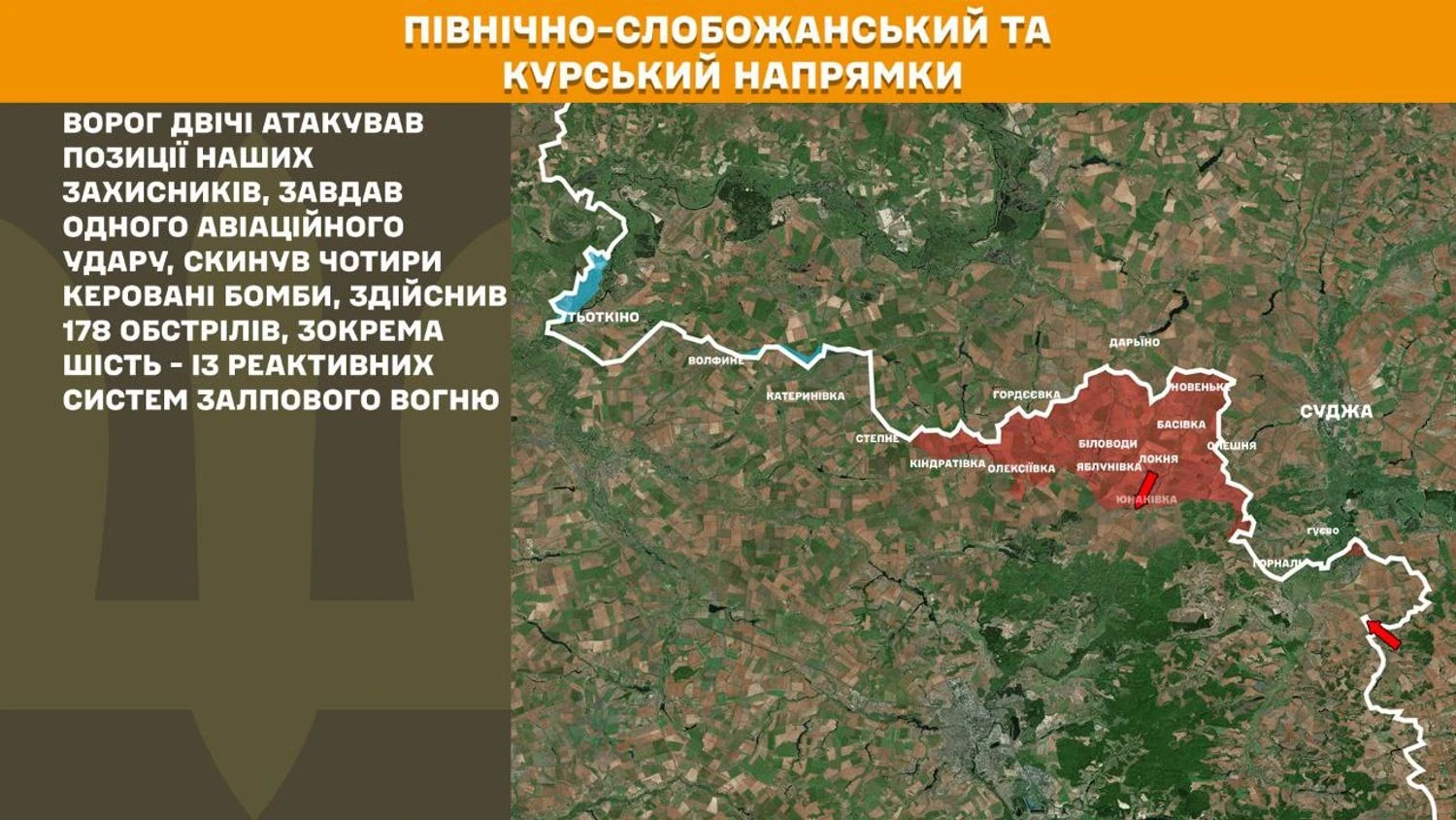 на Північно-Слобожанському і курському напрямках ворог двічі атакував позиції наших захисників, завдав одного авіаційного удару, скинув чотири керовані бомби, здійснив 178 обстрілів, зокрема шість – із реактивних систем залпового вогню;