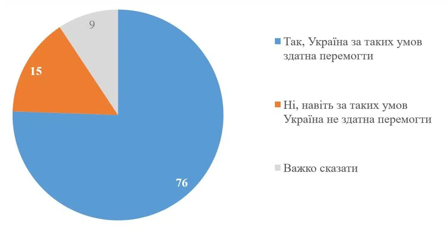 15% українців вважають, що навіть за таких умов Україна не здатна перемогти. Решта 9% не змогли визначитися із відповіддю.