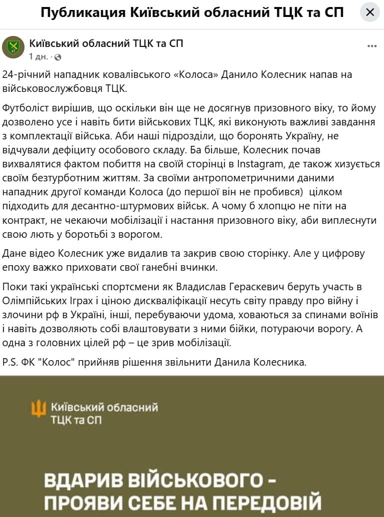 Раніше телеграм-канал Ukraine Context повідомляв, що Колесник опублікував у Stories відео, де він завдає удару співробітнику ТЦК, після чого закрив свою сторінку.
