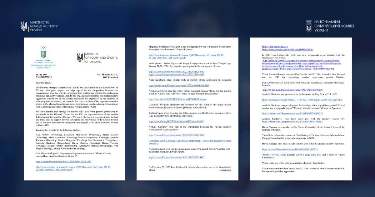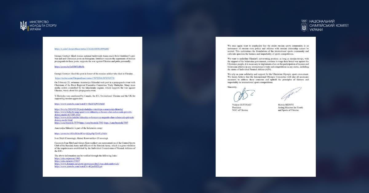У листі зазначається, що серед спортсменів, які отримали дозвіл на участь в Олімпійських іграх від МОК, є представники російської федерації та Республіки Білорусь, котрі відкрито підтримують війну в Україні та політику російської злочинної влади.