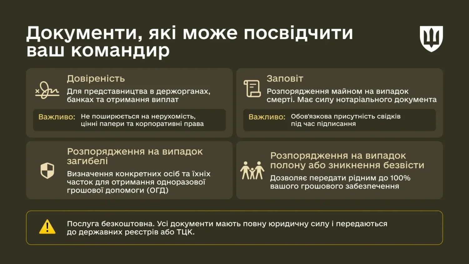 В умовах інтенсивних бойових дій та обмеженого доступу до цивільної інфраструктури держава забезпечила військовослужбовців механізмом прямої реалізації юридичних прав. Командири військових частин наділені повноваженнями посвідчувати документи, що мають повну юридичну силу нотаріально посвідчених актів