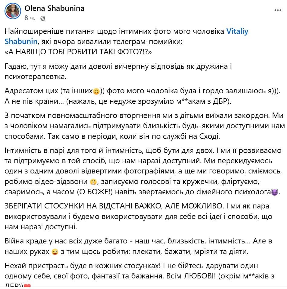Дружина голови правління громадської організації «Центр протидії корупції» Віталія Шабуніна Олена Шабуніна прокоментувала появу інтимних фотографій її чоловіка у телеграм-каналах, заявивши, що ці знімки були адресовані виключно їй. Про це вона написала у своєму Facebook.