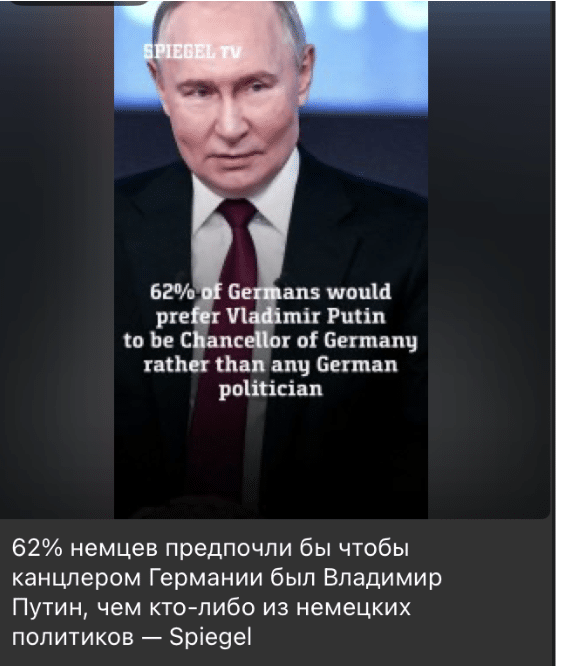 У соціальних мережах поширюється відеоролик із логотипом та оформленням, що імітують стиль німецького новинного мовника Der Spiegel. У відео стверджується, що згідно з опитуванням, проведеним «німецькими журналістами», 62% громадян Німеччини надали б перевагу Путіну як канцлеру, а не комусь з наявних німецьких політиків. Відео також містить цитату німецького політолога Крістофа Бібера (Christoph Bieber), де він порівнює чинного канцлера Фрідріха Мерца з персонажем американського сіткому «Альф».