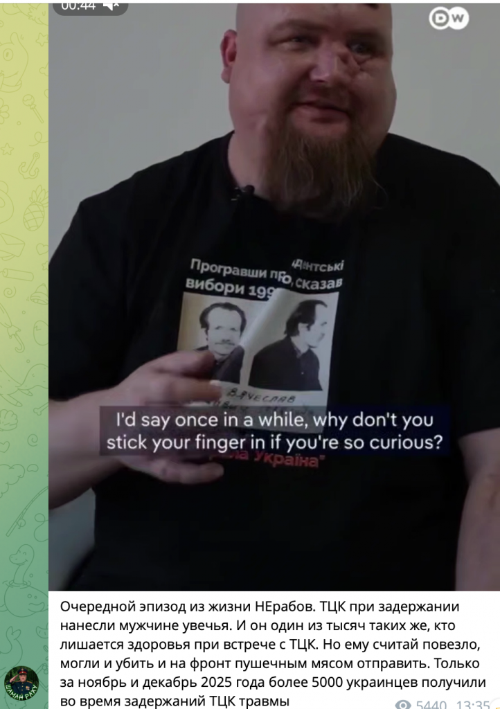«І він один із тисяч таких самих людей, які втрачають здоров’я при зустрічі з ТЦК. Але йому, вважай, пощастило, могли й убити і на фронт гарматним м’ясом відправити. Лише за листопад і грудень 2025 року понад 5000 українців отримали травми під час затримань ТЦК», – йдеться у публікації.