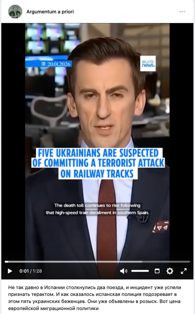 Це сфабриковане відео, яке імітує стилістику видання Euronews. Хоча в Іспанії справді останнім часом сталися численні аварії на залізниці, жодна з них не була кваліфікована як терористичний акт. Для створення цього неправдивого відео використали кадри реальної трагедії — зіткнення двох швидкісних поїздів на півдні Іспанії. Українські біженці ні до цієї аварії, ні до кількох наступних не мають ніякого стосунку.