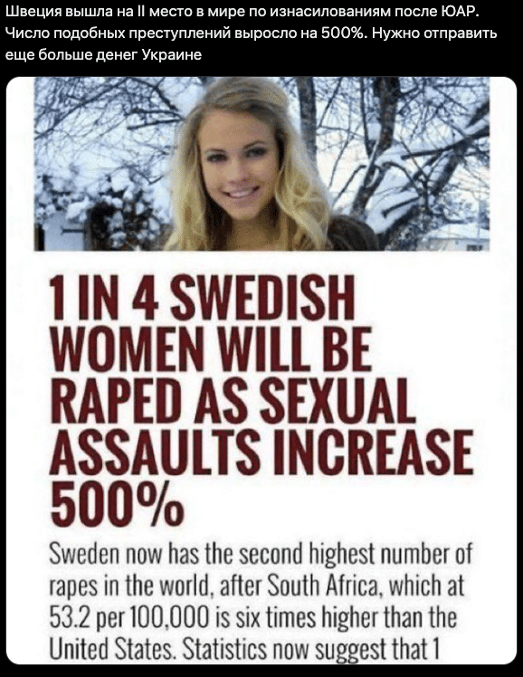 У проросійському сегменті мережі поширюється скриншот заголовка, який стверджує, що рівень згвалтувань у Швеції зріс на 500%, і тепер кожна четверта жінка за своє життя стане жертвою сексуального насильства. «Треба відправити ще більше грошей Україні», іронічно коментують новину пропагандисти, натякаючи, що Швеції варто зайнятися внутрішніми проблемами замість підтримки боротьби проти російської агресії.