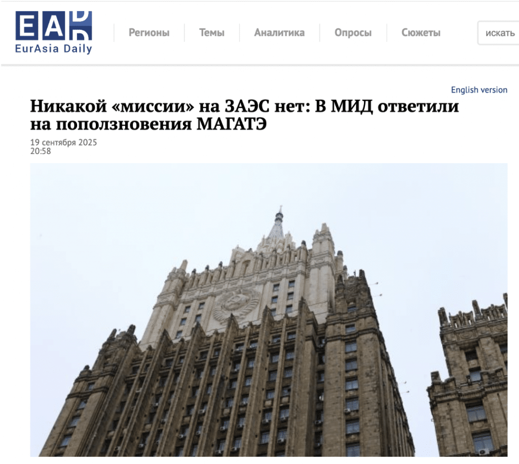 «МАГАТЕ хоче “віджати” Запорізьку атомну електростанцію у її законного власника – Росії»,, – так російські ЗМІ відреагували на резолюцію про ядерну безпеку України в умовах російської агресії, прийняту за підсумками 69-ї сесії Генеральної конференції МАГАТЕ. Агітпроп заявив, що ухвалений документ має носить «суто антиросійський характер і ставить під сумнів територіальну цілісність Росії». Російські ЗМІ також наполягають на «неповноважності» держав-членкинь МАГАТЕ приймати резолюції на підтримку України та заявляють про «відсутність» місії Агентства на тимчасово окупованій ЗАЕС.