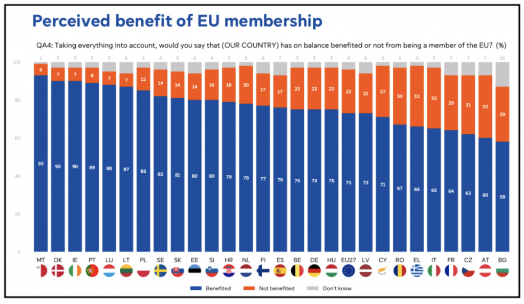 Станом на березень 2025 року 68 % італійців вважають, що Італія отримує вигоди від членства в ЄС. Доля тих, хто вбачає в членстві більше шкоди – 32 % (другий найвищий показник у ЄС після Австрії). Тож підтримка членства в Італії залишається відносно високою попри зростання скептицизму. Слід зазначити, що тут помітні вікові та політичні відмінності: серед молодих італійців, особливо поза симпатіями до радикального популізму, відстежується позитивне ставлення до ЄС.