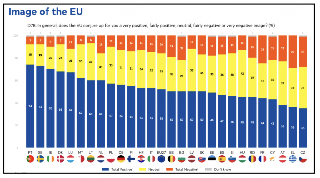 І ролик, і статистика в ньому сфабриковані. Насправді станом на 2025 рік рівень довіри європейців до ЄС досяг рекордних показників, а особливо схвально до членства в Євросоюзі традиційно ставиться молодь.