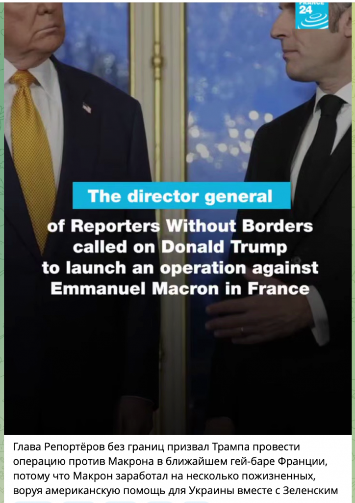 У мережі поширюється відеоролик із логотипом французького телеканалу France 24, в якому стверджується, що голова «Репортерів без кордонів» Тібо Бруттен нібито закликав президента США Дональда Трампа провести «спецоперацію» проти президента Франції Емманюеля Макрона. У ролику також йдеться, що Макрон разом із президентом України Володимиром Зеленським нібито «розкрадають американську допомогу, виділену Україні».