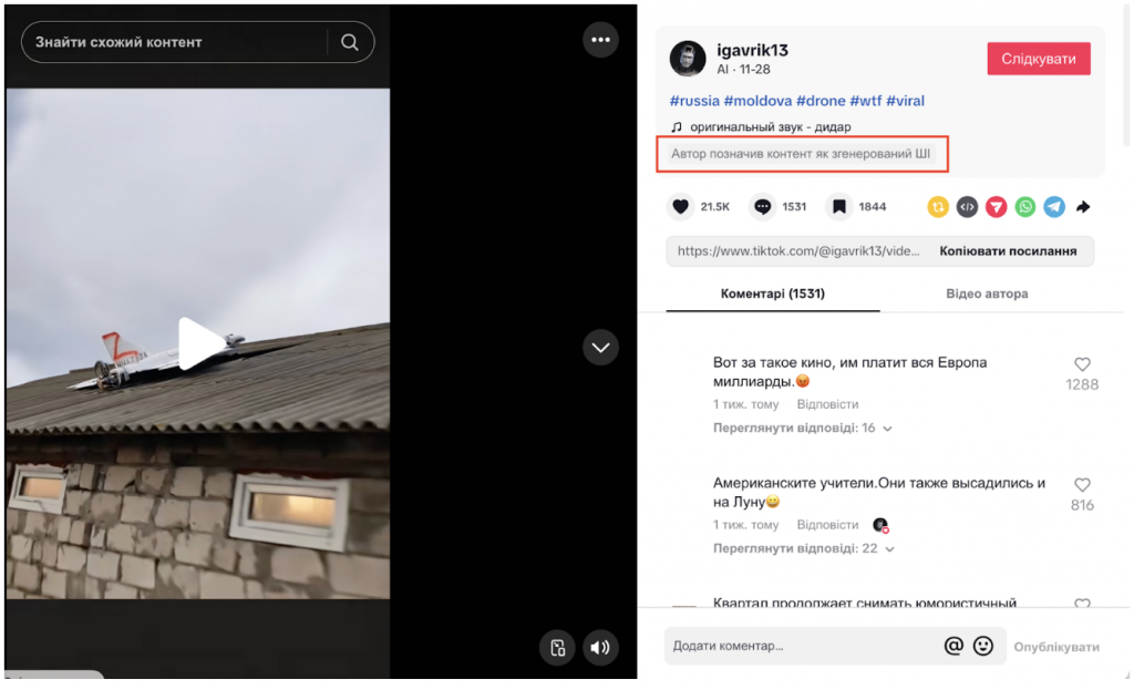 Крім цього, фотографія, яка зафіксувала падіння російського дрона в Молдові і яку агітпроп «поставив під сумнів», є не єдиним доказом. Інформаційний портал NORDINFO Moldova побував на місці події та поспілкувався зі свідками. А журналістам румунського RFI România навіть вдалося зняти місце інциденту та будівлю, на яку впав дрон. Якщо вивчити відео ЗМІ, можна помітити, що на даху будівлі видно трубу. На відео, створеному за допомогою штучного інтелекту, вона відсутня, що є ще одним доказом неправдоподібності заяви агітпропу.