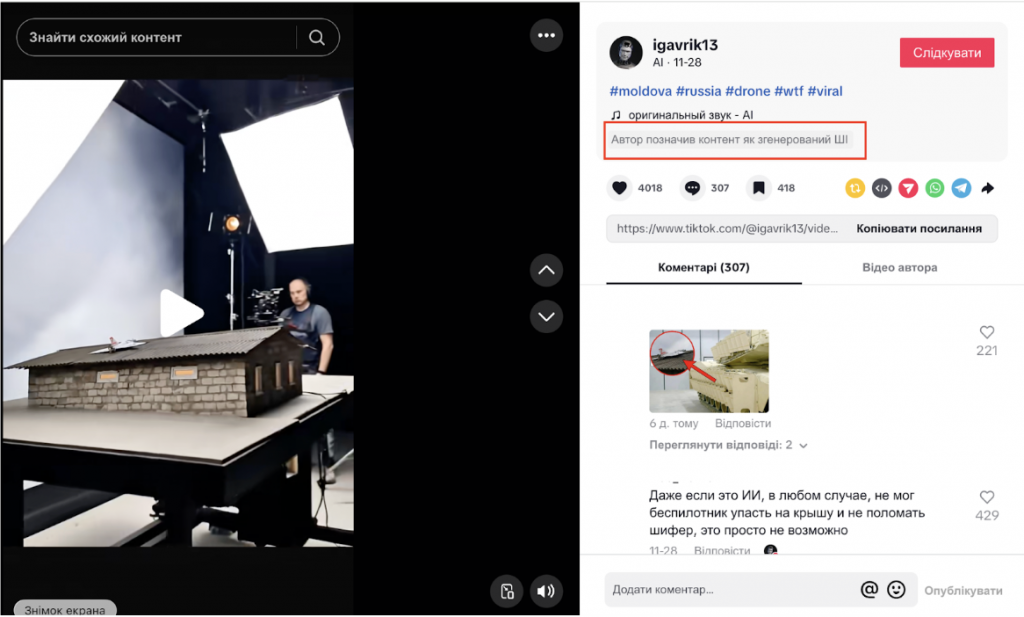 Усі ці відео хоч і виглядають правдоподібно, але зроблені за допомогою штучного інтелекту, на що вказав і сам автор каналу. Для їхнього створення використали фото російського дрона, яке було зроблене молдавською поліцією і масово і поширювалося у ЗМІ. Усі три ролики починаються саме з нього