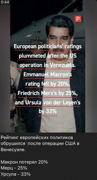 У мережі поширюється відео з логотипом Politico: у ролику йдеться про те, що рейтинги європейських лідерів — Еммануеля Макрона, Фрідріха Мерца, Урсули фон дер Ляєн — стрімко впали відтоді, як США почали військову операцію проти Венесуели 3 січня. Посилаючись на неназваних експертів, у сюжеті стверджують, що справа у лицемірстві європейських політиків, які підтримують Україну в боротьбі проти російської збройної агресії, але не стали засуджувати атаку Штатів. На тлі останніх подій, йдеться у ролику, європейським урядам буцімто все важче переконати своїх виборців у доцільності підтримки України.