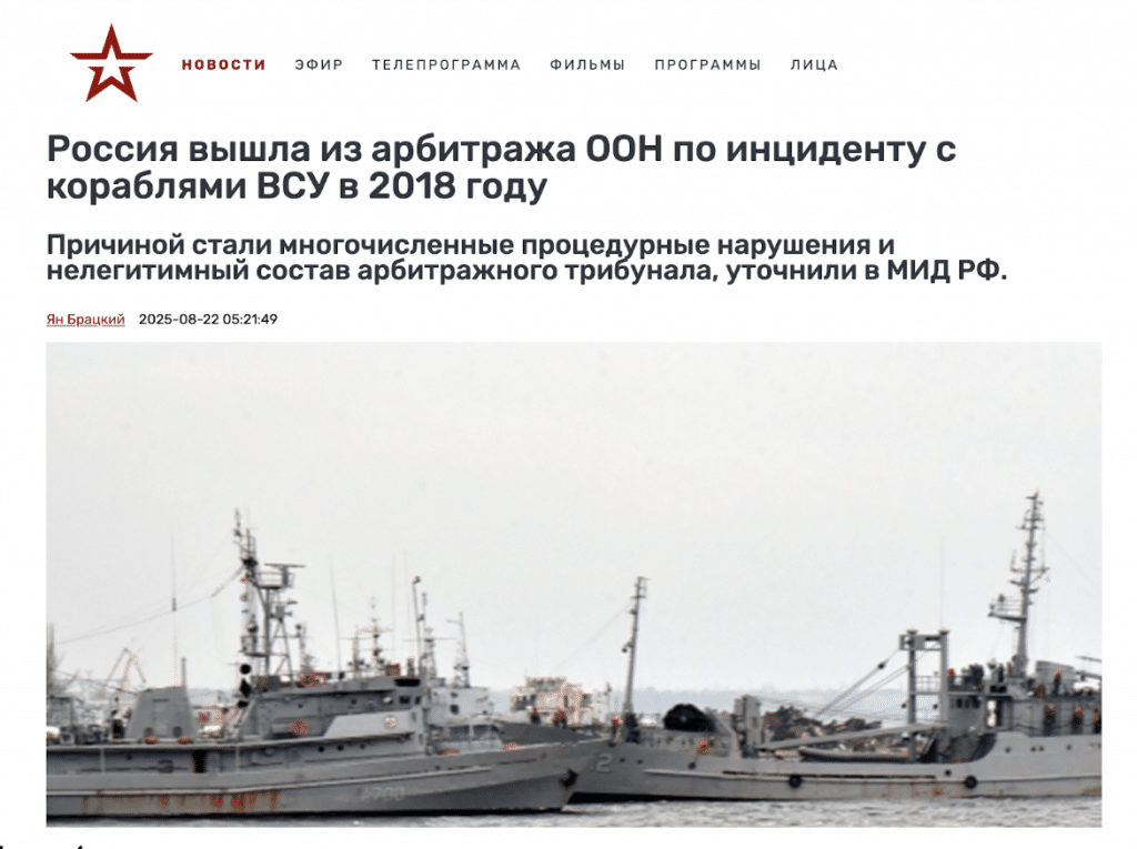 Росія не полишає спроб уникнути відповідальності за злочини, скоєні проти України. Кремль вийшов із судового процесу в Арбітражному трибуналі в Гаазі щодо затримання у Чорному морі трьох українських військових кораблів та їхніх екіпажів у листопаді 2018 року. Процедура супроводжувалася потоком фейків, у яких Росія заявила, що причиною виходу стали «грубі процедурні порушення» під час проведення розгляду та «нелегітимний склад арбітражного трибуналу». Агітпроп стверджував, що рішення міжнародних арбітрів «не матиме юридичної сили і не буде визнано Росією». Також пропагандисти нарікали, що «пов’язані з Україною проблеми» регулярно «викликають збої» у роботі інститутів ООН.
