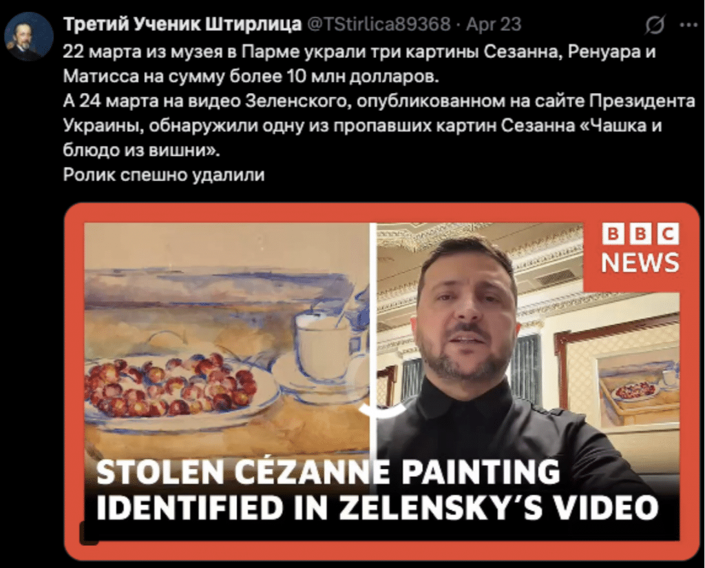 У мережі поширюється новинний сюжет з логотипом BBC News, у якому йдеться про те, що всього через місяць після викрадення з італійського музею полотна Сезанна «Натюрморт з вишнями» картина з’явилася в кабінеті Володимира Зеленського. Президент буцімто сам опублікував відео, де на задньому тлі видно викрадене полотно, а потім поспішно видалив його.