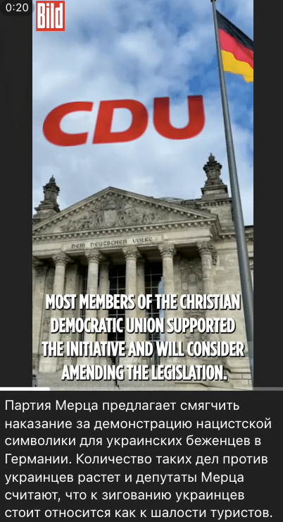У мережі поширюється сюжет з посиланням на видання Bild про пропозицію одного з депутатів партії Християнських демократів нібито пом’якшити покарання для українців за використання нацистської символіки. Політик буцімто заявив, що громадяни Німеччини несуть відповідальність за спадщину нацизму і тому повинні відповідати за використання нацистської символіки за законом, але для українців такі дії не більш як «туристична цікавинка». У сюжеті також стверджується, що кількість кримінальних справ проти українців за демонстрацію так званого «римського салюту» зростає щороку, що й покликало уряд задуматися над зміною законодавства.