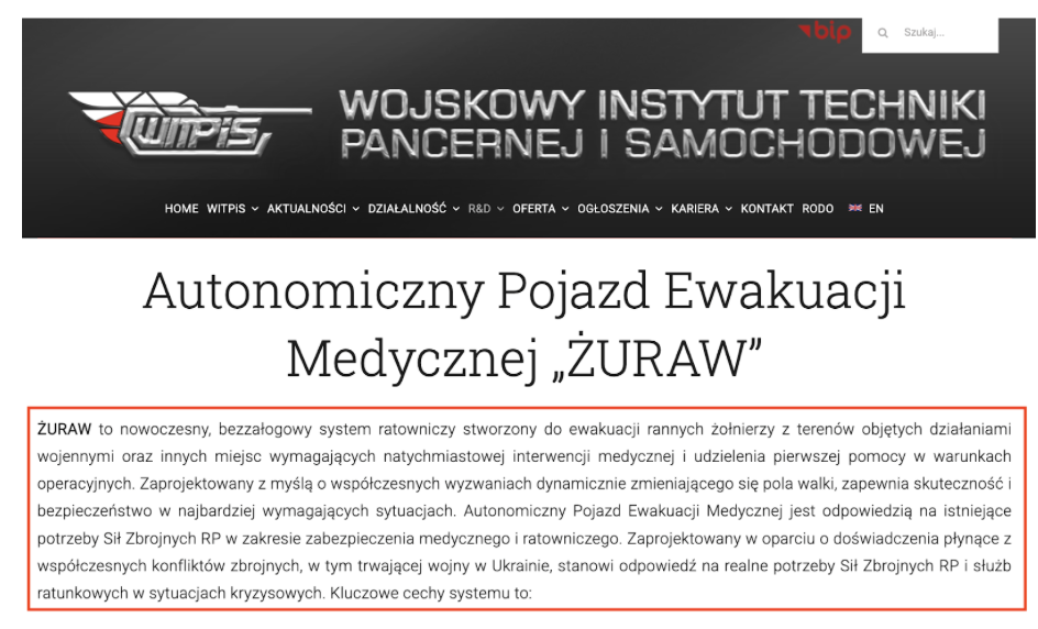 «”ŻURAW” — це сучасна безпілотна рятувальна система, призначена для евакуації поранених солдатів із зон бойових дій та інших місць, які вимагають негайної медичної допомоги та надання першої допомоги в умовах бойових дій», — йдеться в описі.