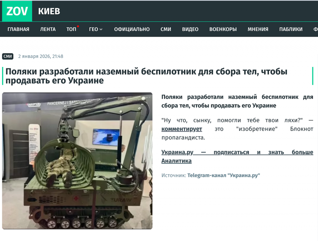 Російський агітпроп не полишає спроб дискредитації польсько-українських відносин. Цього разу кремлівські ЗМІ та користувачі соцмереж поширюють інформацію про те, що у Польщі нібито створили спеціальний безпілотник для збирання тіл із метою заробити в Україні на цьому. Як доказ публікується фотографія цього безпілотника.