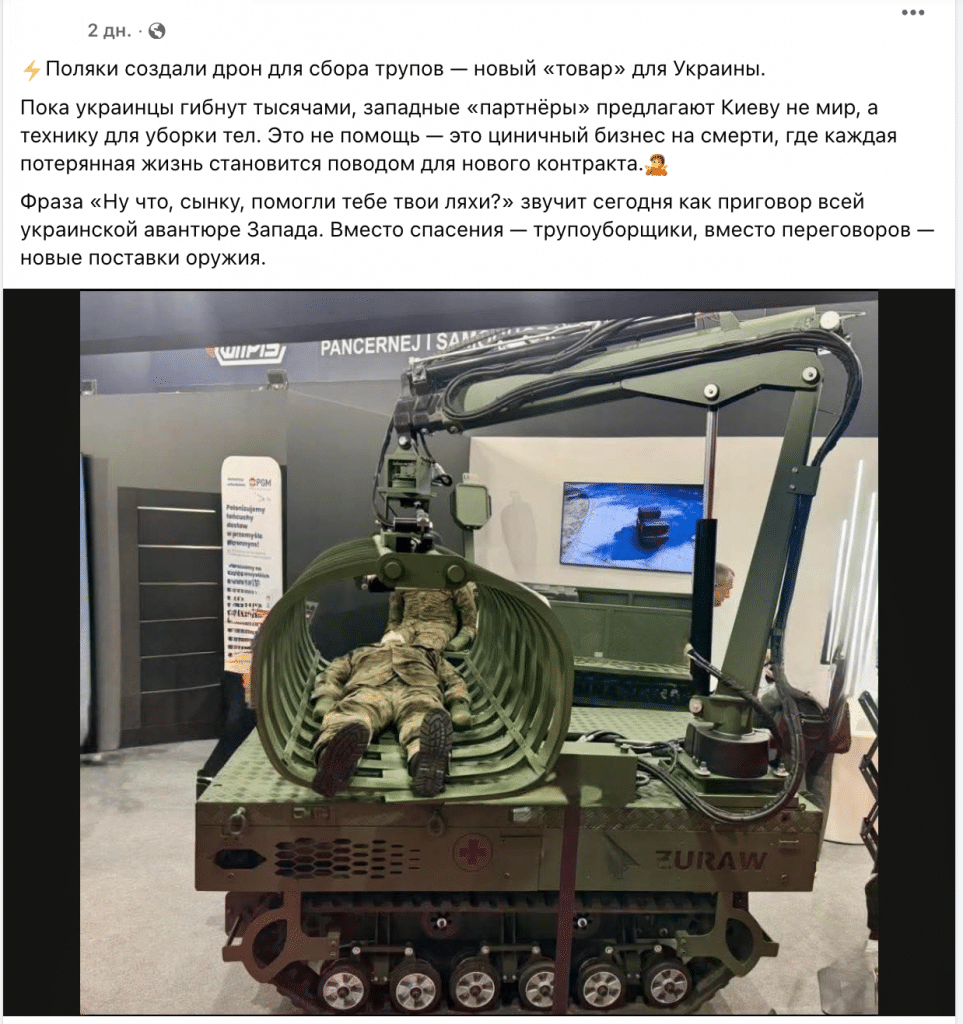 Російський агітпроп не полишає спроб дискредитації польсько-українських відносин. Цього разу кремлівські ЗМІ та користувачі соцмереж поширюють інформацію про те, що у Польщі нібито створили спеціальний безпілотник для збирання тіл із метою заробити в Україні на цьому. Як доказ публікується фотографія цього безпілотника.