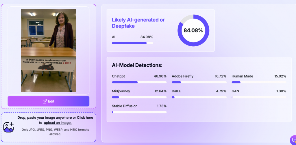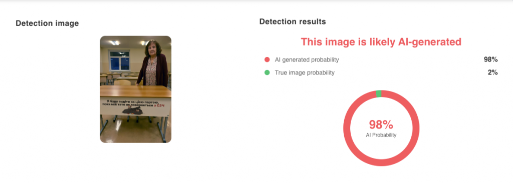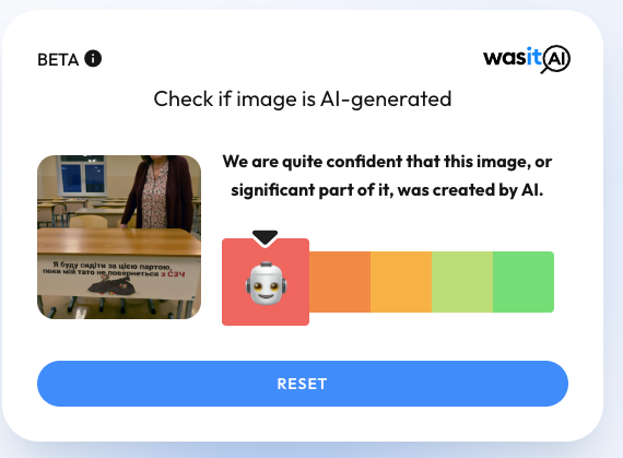 Аналогічний висновок видає ще один інструмент для детекції згенерованих зображень, /wasitai: «ми переконані, що це зображення, або значна його частина, було згенеровано з допомогою штучного інтелекту».