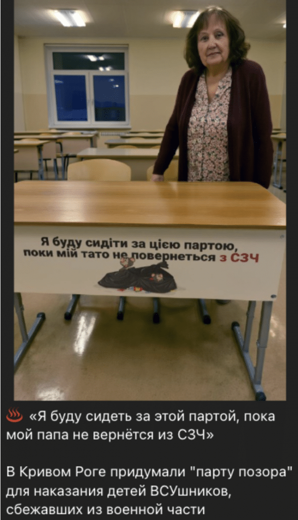 У мережі поширюється знімок, буцімто зроблений в одній зі шкіл Кривого Рогу. На ньому вчителька стоїть біля шкільної парти з написом: «Я буду сидіти за цією партою, поки мій тато не повернеться з СЗЧ (самовільне залишення частини – прим. ред.)».