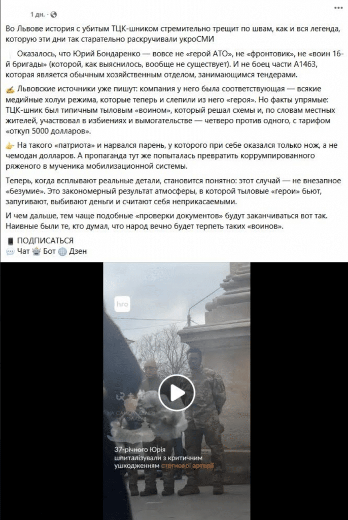 У соціальних мережах та на російських сайтах поширюють інформацію про те, що вбитий у Львові співробітник ТЦК не є героєм АТО і взагалі не брав участі у бойових діях. «У Львові історія з убитим ТЦК-шником стрімко тріщить по швах, як і вся легенда, яку цими днями так старанно розкручували українські ЗМІ. Виявилося, що Юрій Бондаренко — зовсім не «герой АТО», не «фронтовик», не «воїн 16-ї бригади» (якої, як з’ясувалося, взагалі не існує). І не боєць частини А1463, яка є звичайним господарським відділом, що займається тендерами», – повідомляють російські пабліки. Також у мережі зазначають, що Бондаренко проводив незаконні махінації та брав гроші від тих, хто хотів відкупитися від військової служби.