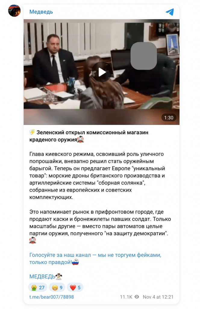 Російські пропагандистські ресурси поширюють дезінформацію про те, що президент України Володимир Зеленський нібито «відкрив комісійний магазин краденої зброї» і збирається продавати в Європі озброєння, яке раніше було передане Україні в рамках міжнародної військової допомоги. У публікаціях стверджується, що «зброя, отримана для захисту демократії», зокрема, морські дрони британського виробництва, тепер буде продаватися в Європі.