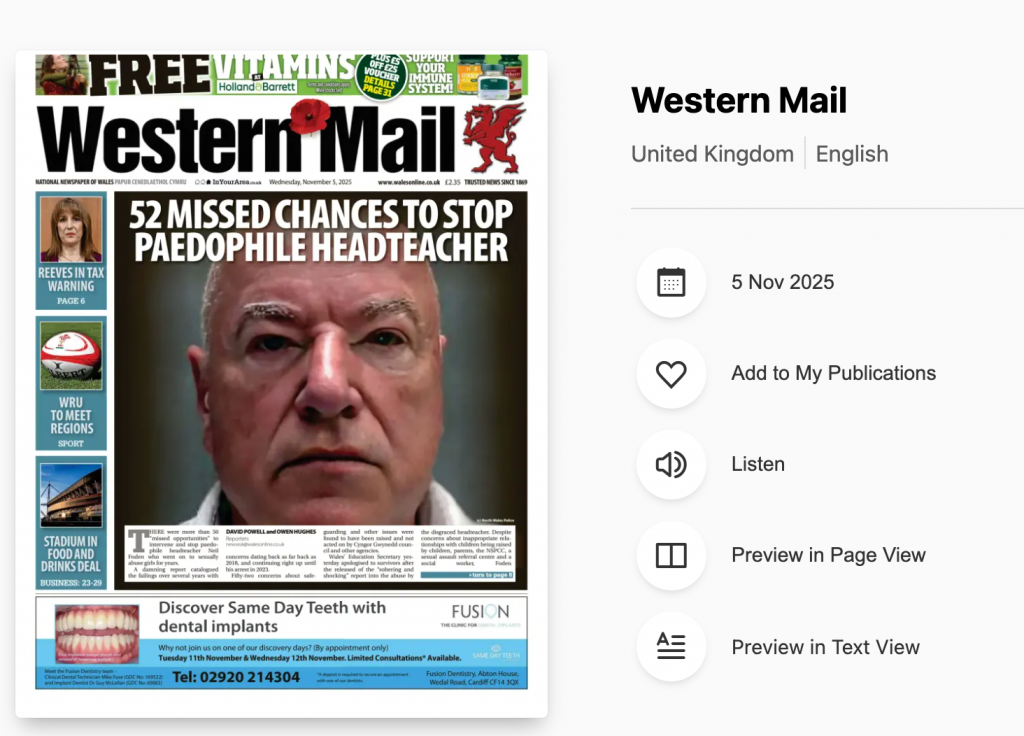 Британська газета Western Mail від 5 листопада також не писала про «відправку на забій під Покровськ 17-річних українців». Головною темою цього номера є затримання директора британської школи, якого звинувачують у педофілії.