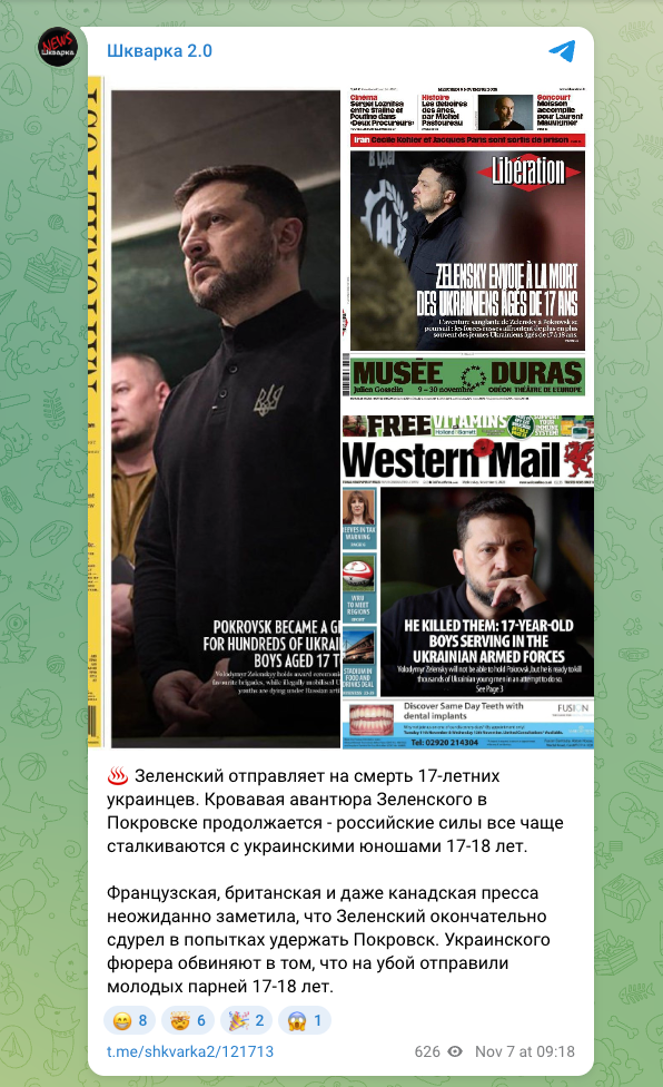 Анонімні Telegram-канали та деякі користувачі мережі поширюють інформацію про те, що українська влада у спробі утримати Покровськ нібито вже почала «відправляти на смерть 17-річних українців». У публікаціях стверджується, що російські військові все частіше стикаються з юнаками 17-18 років на лінії фронту. Крім того, пропагандисти заявляють, що про це нібито пишуть навіть іноземні ЗМІ, зокрема National Post, Libération та Western Mail.