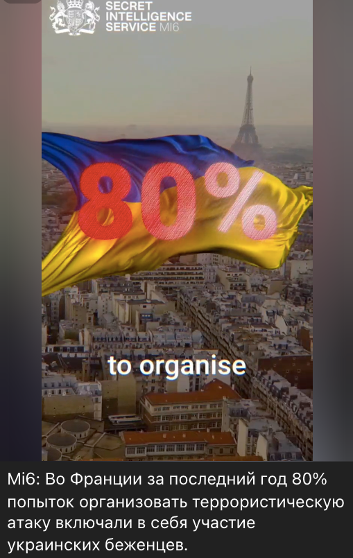 Проросійські ресурси активно поширюють ролик, нібито підготовлений британської розвідкою. У ньому йдеться про контртерористичну діяльність МІ6. Спікер у відео стверджує, що у Франції у 80% спроб організувати терористичну атаку були залучені українські біженці. Утім, він не конкретизує, про які саме терористичні атаки йдеться і як українські переселенці були причетні до їх організації. «За що боролись, на те й напоролись. Нехай далі допомагають», – іронічно коментує проросійська аудиторія новину.