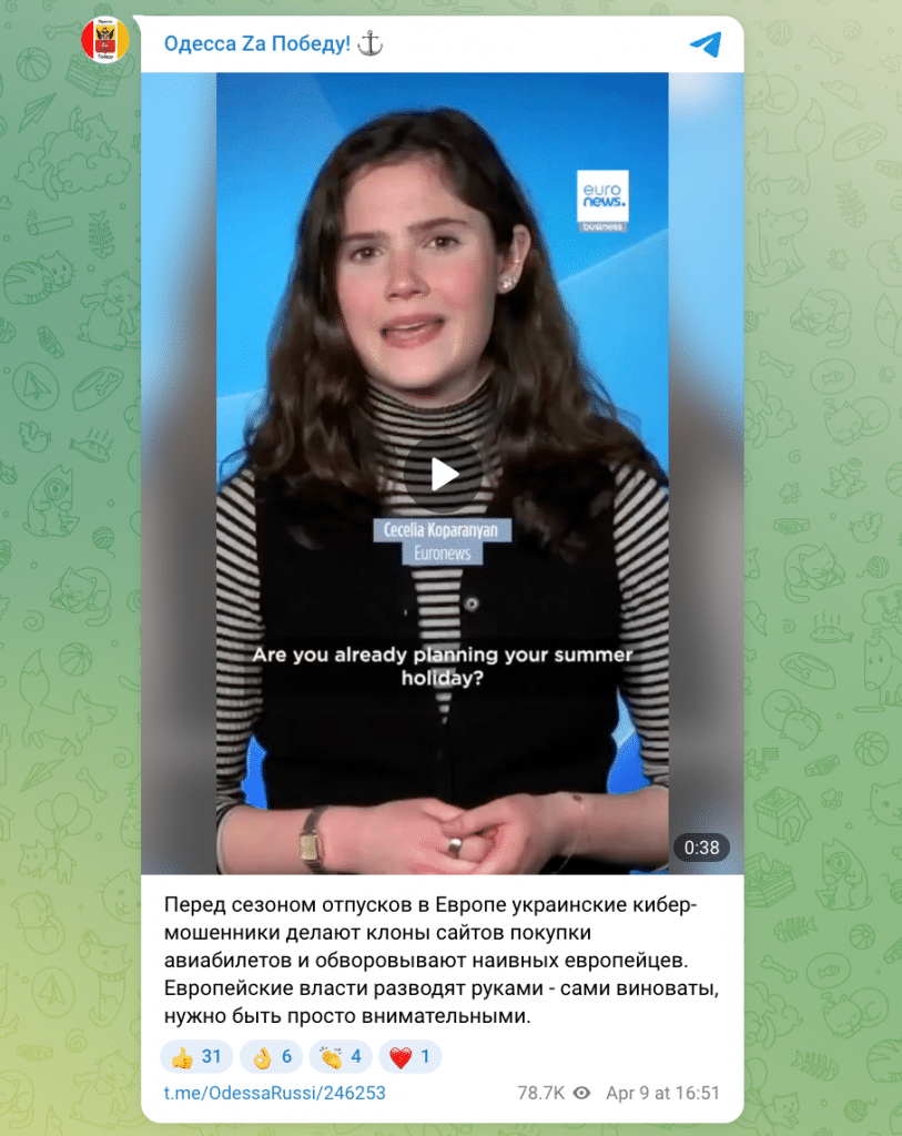 Цей відеоролик є фальшивкою. Пропагандисти використали реальний сюжет Euronews від 7 квітня 2024 року, який був присвячений зростанню цін на авіаквитки через конфлікт на Близькому Сході, і наклали на нього сфабриковану аудіодоріжку.