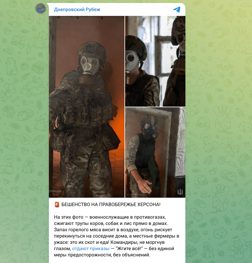 Деякі анонімні Telegram-канали поширюють фотографії українських військовослужбовців у протигазах, стверджуючи, що вони нібито спалюють трупи корів, собак і лисиць, заражених сказом, безпосередньо у будинках жителів Херсонщини.