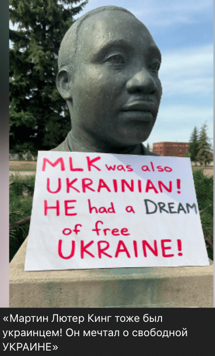 Низка проросійських джерел опублікували фото меморіала Мартіну Лютеру Кінгу у місті Енкоридж, який нібито спаплюжили українці. На зображенні видно, що під погруддям лідера руху за права темношкірих громадян США встановлена табличка з написом: «МЛК також був українцем! Він мріяв про вільну Україну!». Пропагандисти називають цей вчинок неповагою до національних героїв інших країн.