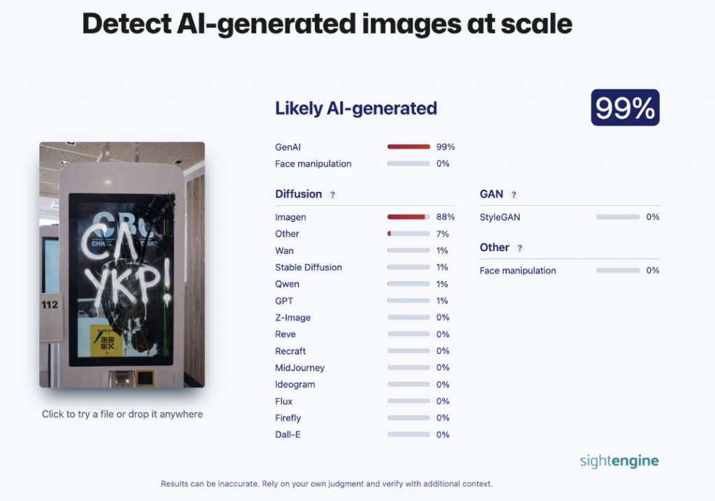 Перевірка зображення за допомогою сервісу SightEngine показала, що воно було повністю або частково створене або відредаговане за допомогою інструментів штучного інтелекту Google. На це вказує і цифровий водяний знак SynthID, інтегрований у пікселі зображення, який був виявлений чат-ботом Gemini.