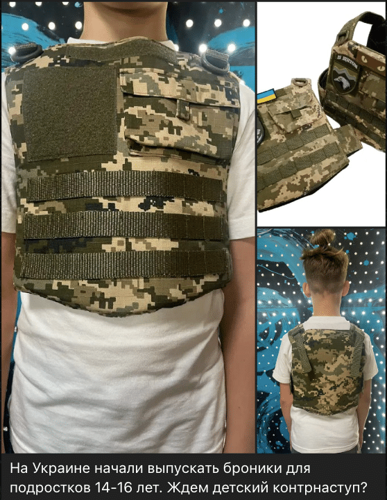 Російські пропагандисти поширюють фото дитячих бронежилетів, які нібито з’явилися в продажу в Україні. «Чекаємо на дитячий контрнаступ?», з насмішкою питають автори публікацій, очевидно натякаючи на те, що в українське військо скоро призиватимуть неповнолітніх.