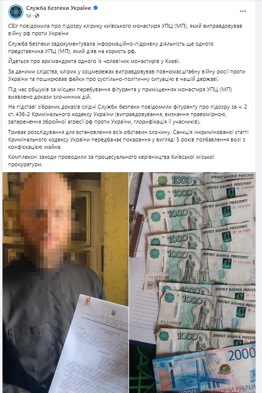«У Свято-Введенський монастир, розташований у центрі Києва, нагрянула СБУ. Вчора там пройшли обшуки. Внаслідок обшуку в монастирі знайшли кілька рублевих купюр. На підставі цього СБУ повідомила про підозру архимандриту Володимиру (в миру Олексій Ракк). Йому загрожує п’ять років в’язниці з конфіскацією», — пише агітпроп.
