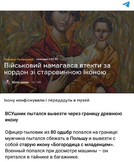 У соціальних мережах і на російських пабліках поширюють інформацію про те, що військовий ЗСУ нібито намагався вивезти через кордон давню ікону. «Офіцер-тиловик із 80 ОДШБр попався на кордоні: чоловік намагався втекти до Польщі й вивезти з собою стару ікону «Богородиця з немовлям». Військовий попався під час огляду машини — він ховав її у схованці у багажнику», — повідомляють у соцмережах.