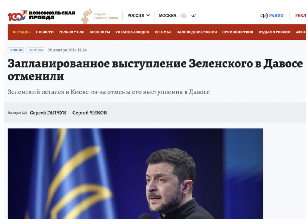 Прокремлівські медіа поширили дезінформацію про делегацію України, яка бере участь у щорічному Всесвітньому економічному форумі у швейцарському Давосі. Російський агітпроп стверджує, що це організатори форуму нібито скасували виступ президента України Володимира Зеленського, через що український лідер потім «відмовився від поїздки» до Швейцарії і залишився у Києві: «очільника київського режиму назвали перешкодою на шляху до врегулювання українського конфлікту», – пише агітпроп.