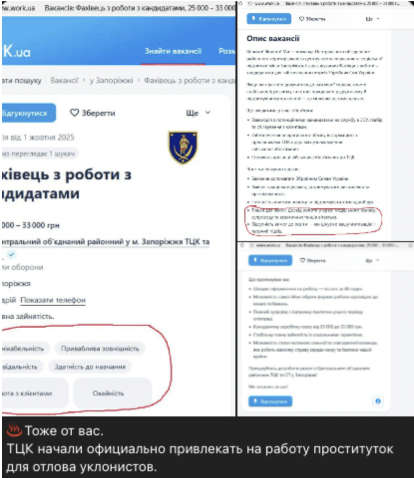 У мережі поширюються скриншоти вакансії, яку нібито розмістив запорізький ТЦК та СП: у ній шукають «фахівця для роботи з кандидатами» лише серед жінок з досвідом у сфері модельного бізнесу, екзотичних танців чи ескорту. В обов’язки кандидатки буцімто входить оперативно повідомляти ТЦК про місцезнаходження військовозобов’язаних чоловіків. З тексту оголошення пропагандисти роблять висновок, що таким чином ТЦК офіційно залучає до співпраці секс-працівниць, щоб ті знаходили і передавали їм чоловіків для мобілізації.