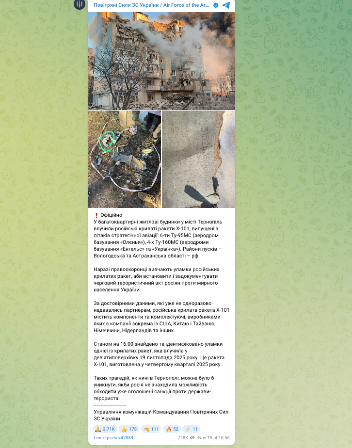 У ніч проти 19 листопада Росія завдала по Україні комбінованого удару. За даними української сторони, було випущено понад 470 безпілотників і 48 ракет різних типів, у тому числі крилатих ракет Х-101 і «Калібр». Одним із ключових епізодів цієї атаки став удар по Тернополю: було уражено два дев’ятиповерхових житлових будинки, один із них практично зруйнований з 3 по 9 поверх, другий загорівся. Поки що відомо як мінімум про 26 загиблих, серед них не менше ніж троє дітей, і понад 73 поранених. Пошуково-рятувальні роботи на місці трагедії тривають.