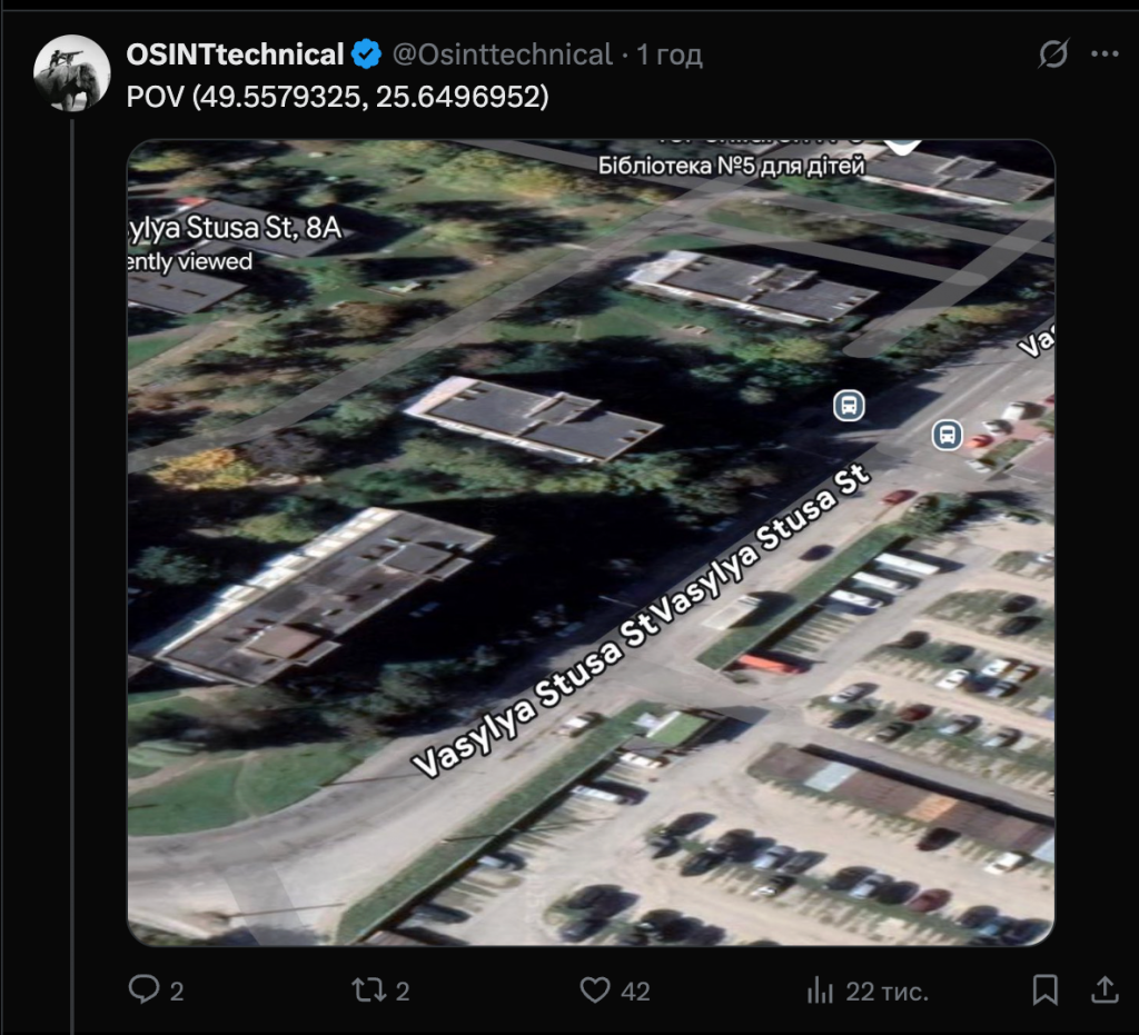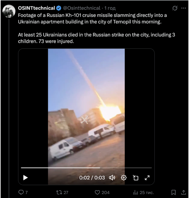 OSINT-аналітик, що веде аккаунт у X під ніком OSINTtechnical, проаналізував опубліковані кадри, ідентифікував місце зйомки й підтвердив, що на відео саме російська ракета Х-101, яка вражає житловий будинок у Тернополі.