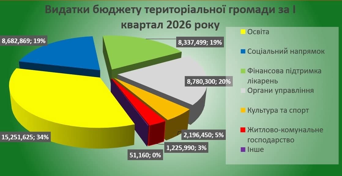 За звітний період із бюджету використано 44 525 893 грн. Частина коштів залишилася як фінансовий резерв для критичних і захищених статей. Розподіл видатків відображає пріоритети громади.