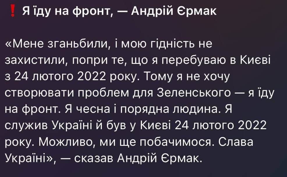 Колишній голова ОП Андрій Єрмак заявив, що має намір вирушити на фронт і «готовий до будь-яких наслідків». Про це екскерівник Офісу президента розповів в інтерв’ю The New York Post, зазначивши, що вважає себе «чесною та порядною людиною» та може більше не відповідати на дзвінки.