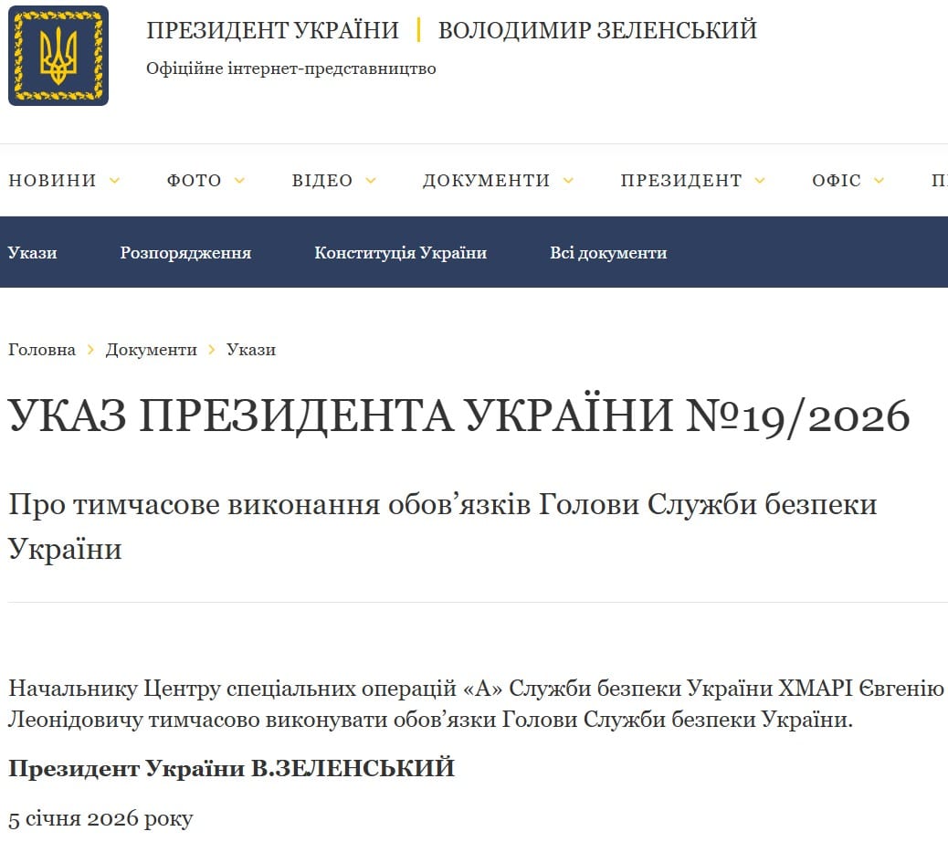 Шостий президент України Володимир Зеленський доручив начальнику Центру спеціальних операцій «А» Служби безпеки України Євгенію Хмарі тимчасово виконувати обов’язки голови СБУ. Відповідний указ №19/2026 оприлюднено на сайті глави держави у понеділок, 5 січня.