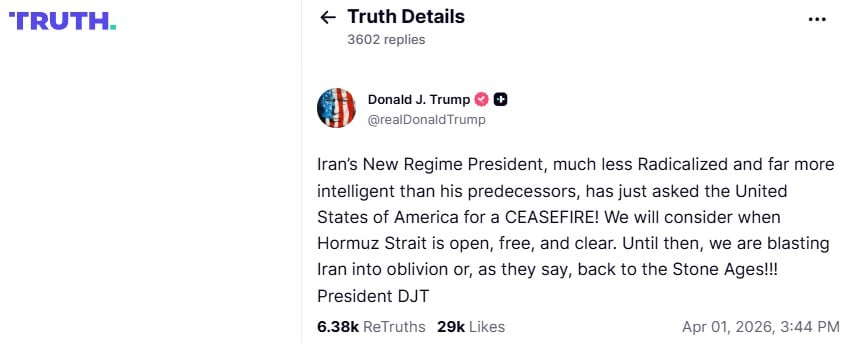 Влада Ірану запропонувала Сполученим Штатам впровадити режим припинення вогню. Про це заявив Дональд Трамп, який повідомив про нібито звернення з боку Ірану із відповідною пропозицією перемир’я. Свій допис він оприлюднив у власній соцмережі Truth Social у середу, 1 квітня.