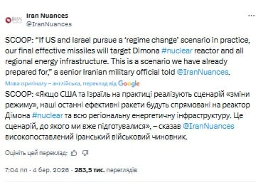 За словами неназваного високопоставленого іранського військового чиновника, якого процитувало видання Iran Nuances, у разі реалізації такого сценарію ракети можуть бути спрямовані на ядерний реактор у Дімоні. А також на енергетичну інфраструктуру регіону.