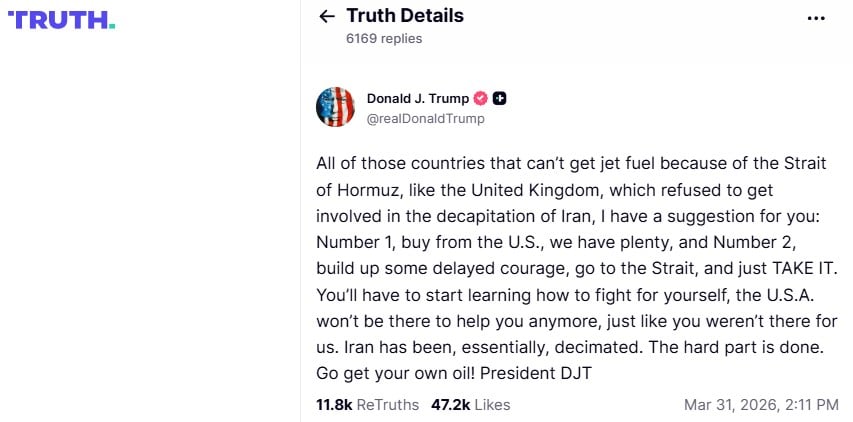 📢 «Усім тим країнам, які не можуть отримати авіаційне паливо через проблему Ормузької протоки, таким як Велика Британія, яка відмовилася брати участь у “обезголовленні” Ірану, у мене є пропозиція: по-перше, купуйте у США – у нас достатньо палива; а по-друге, наберіться все-таки сміливості, йдіть у протоку і просто візьміть її», — написав він.